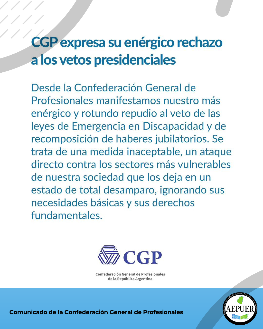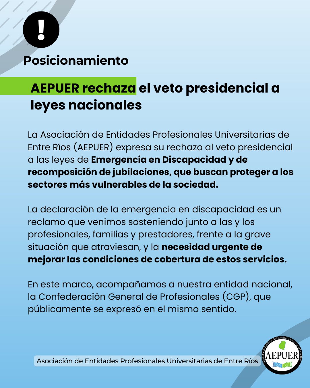 La Asociación de Entidades Profesionales Universitarias de Entre Ríos (AEPUER) expresa su rechazo al veto presidencial a las leyes de Emergencia en Discapacidad y de recomposición de jubilaciones, que buscan proteger a los sectores más vulnerables de la sociedad.